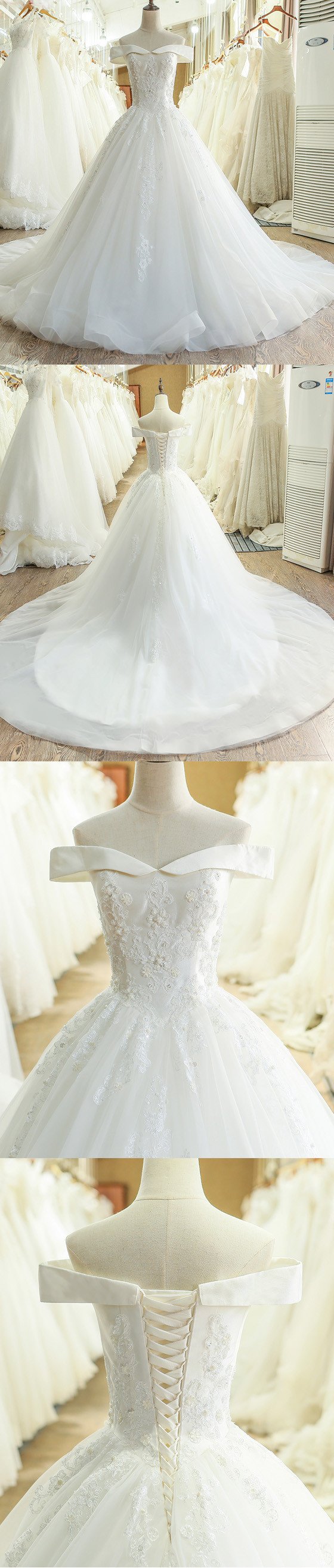 A-Line Lace Off Shoulder Backless Applique Sequin Beautiful Wedding Dresses with Chapel Train,220054