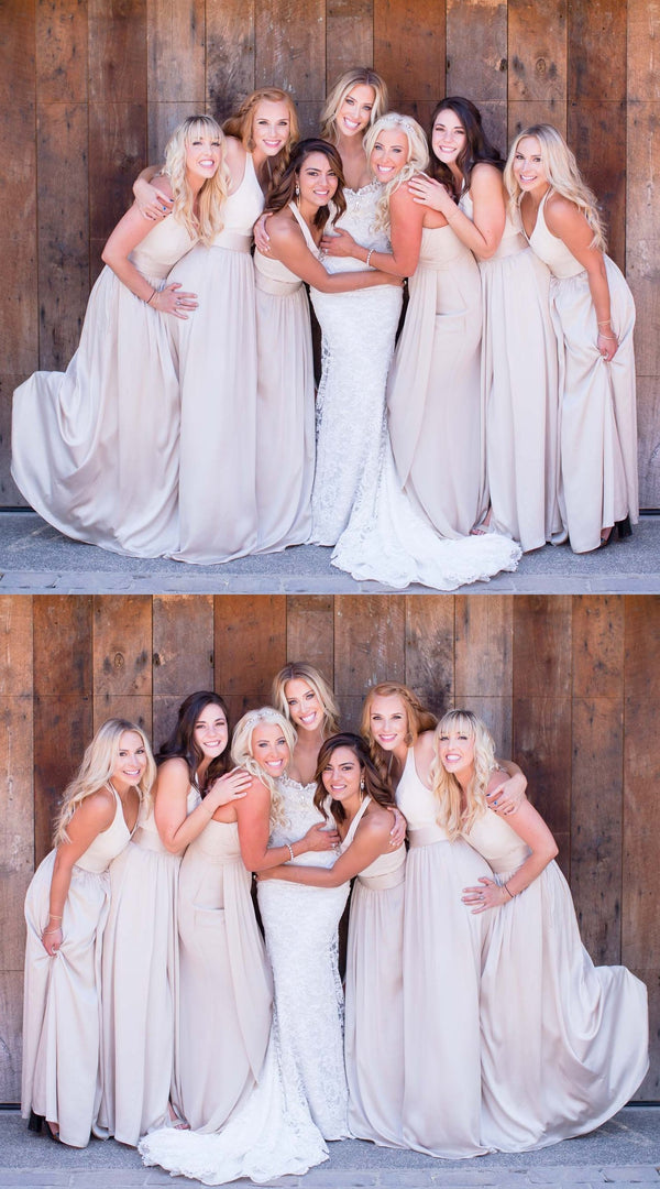 V-Neck Elastic Satin A-Line Backless Cheap Long Bridesmaid Dresses, FC909