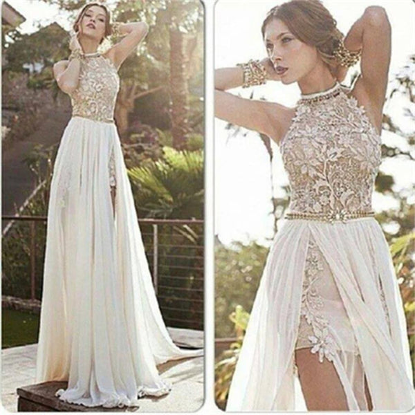 Sexy Lace Backless Long Chiffon Prom Dresses, High Neckline Halter Sid