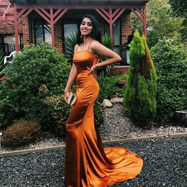 Spaghetti Straps Silk Elastic Satin Mermaid Charming Backless Prom Dresses, FC2385