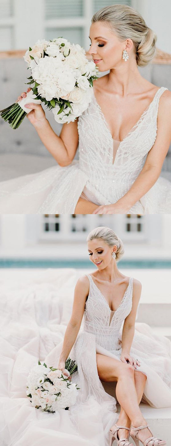 Luxury A-Line Lace Backless V-Neck TulleSleeveless Slit Wedding Dresses, FC1710