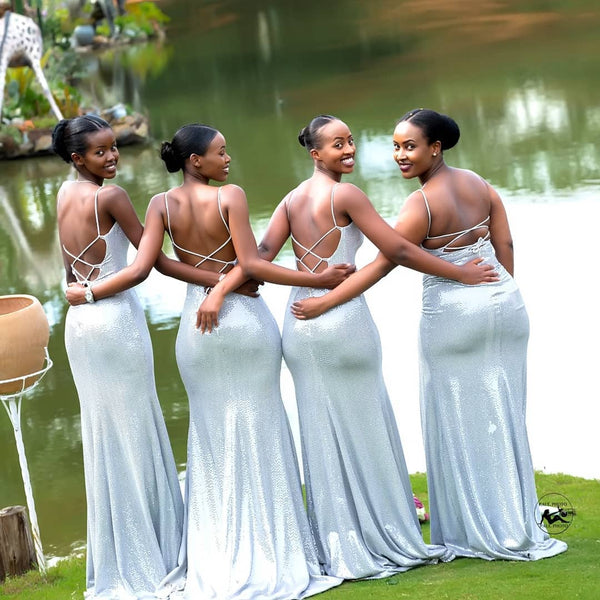 Sparkle Sequin Spaghetti Straps V-neck Sexy Side Slit Backless Bridesm