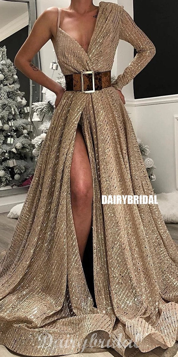 Unique Long Sleeve Sequin A-line Slit V-neck Prom Dresses, FC4143 Unique Long Sleeve Sequin A-line Slit V-neck Prom Dresses, FC4143