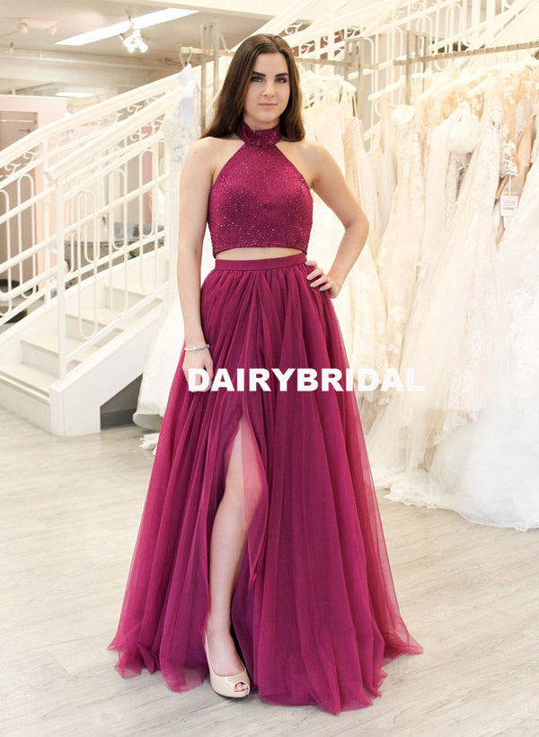Two Pieces Tulle A-Line Halter Beaded Backless Prom Dresses, D1066