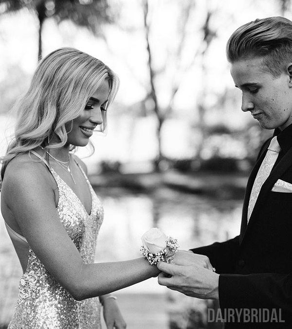 Mermaid Sparkly Silver Sequin Backless V-Neck Spaghetti Straps Prom Dresses, FC1940